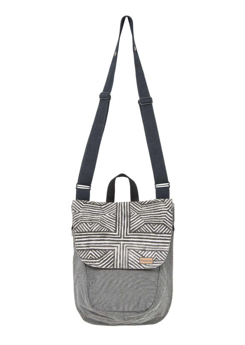 A stylish, medium-sized shoulder bag featuring Xikrin cultural prints. Grey and sophisticated.