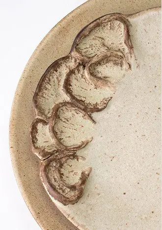 Texturas naturais e poesia visual definem este prato de refeição em cerâmica. A superfície suave, pontuada de maneira orgânica, encontra nas marcas decorativas da borda um detalhe artístico que o transforma em peça de destaque à mesa. O contraste entre o tom terroso e os relevos esmaltados dá personalidade sem exagero, criando um equilíbrio perfeito entre rusticidade e elegância.