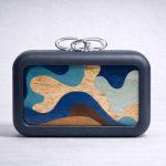 Fluid organic marquetry cedar wood clutch in blue. Clear acrylic clasp, removable leather strap, suede lining. 40% certified wood sustainable luxury. Unique natural variation 20x13x6cm Brazilian craft.